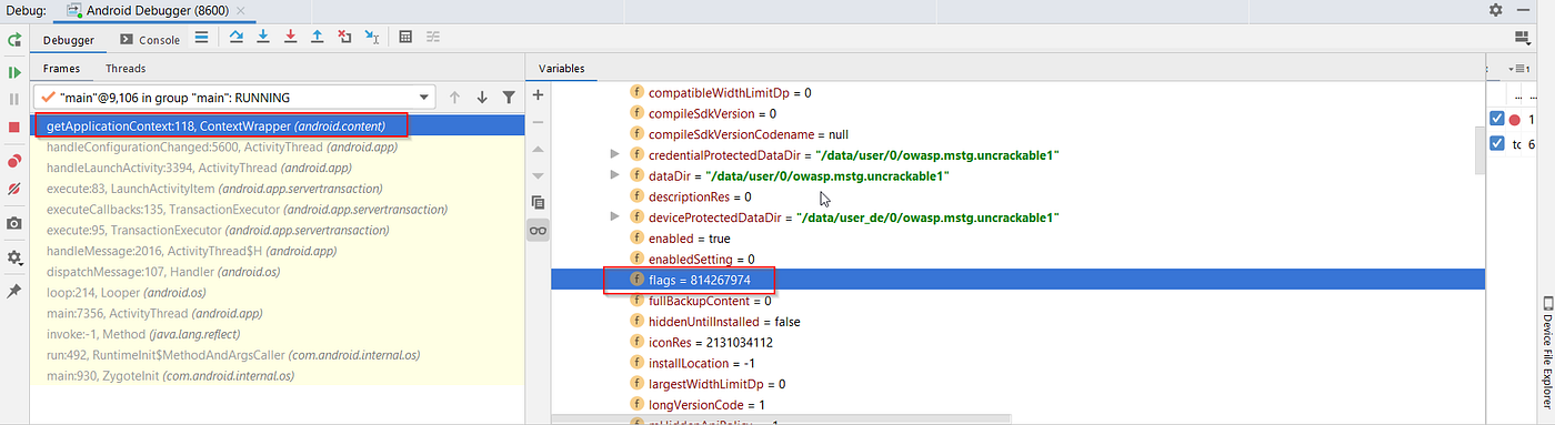 flags = 814267974is11000011100111011110, indicating that the "Flag_debuggable" is active.