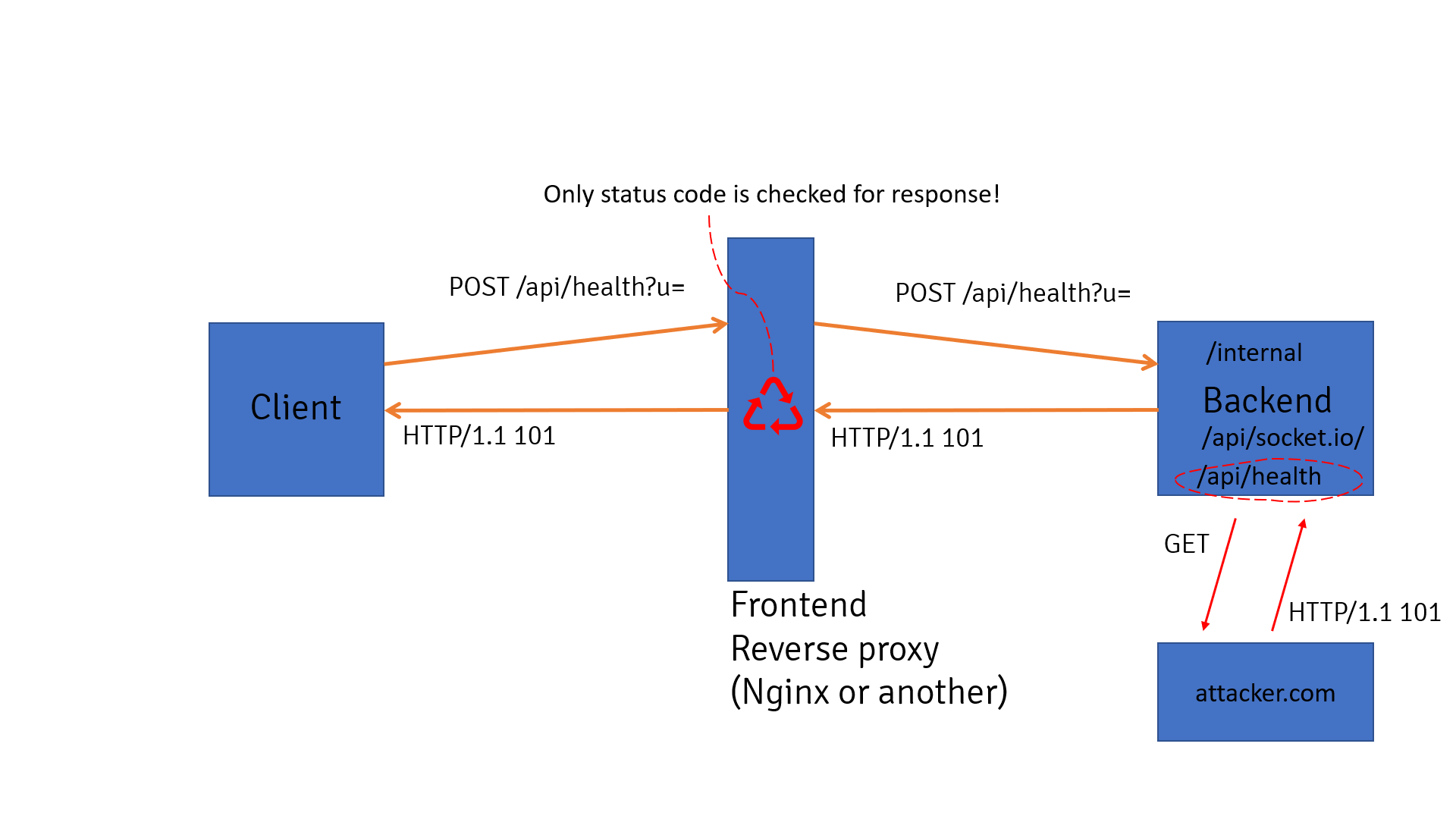 Upgrade: websocket. NGINX, serving as the reverse proxy, interprets this as a standard Upgrade request based solely on theUpgradeheader, neglecting the request's other aspects, and forwards it to the backend.The backend executes the health check API, reaching out to an external resource controlled by the attacker that returns a HTTP response with status code